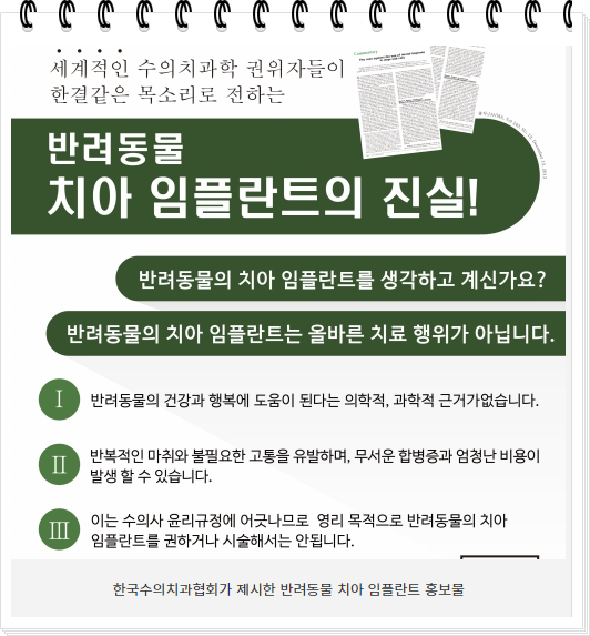 더군다나 강아지, 고양이 임플란트의 안정성, 효용성이 임상적으로 입증되지 않은 터에 소수의 실험견을 통해 그 데이터를 판명할 수는 없다는 입장입니다.